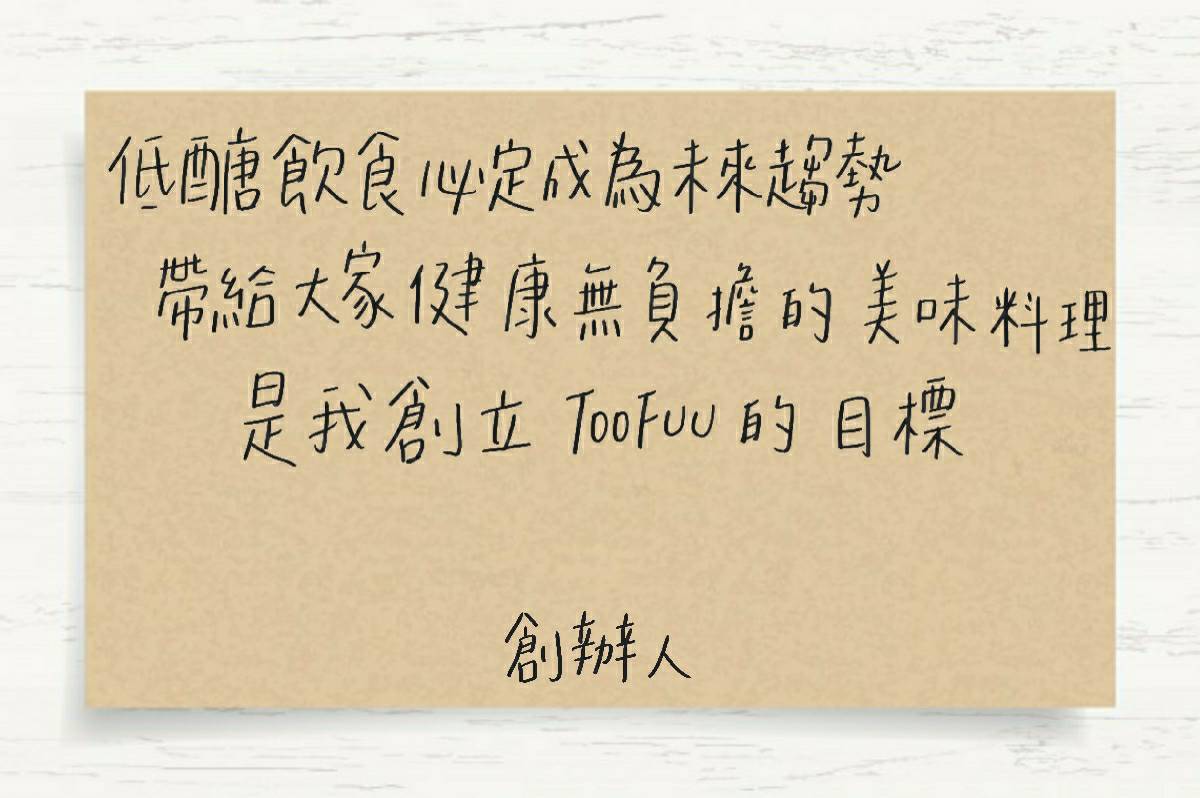 一個寂靜的夜晚,忙了一整天沒辦法好好吃飯的創辦人鶴卷先生看著街 道上一間間熄燈的餐館,想著”如果有可以兼顧健康、美味、飽足感的 主食就好了……” 當時的念想,在一個因緣際會下,終於有機會實現,鶴卷先生秉持著職 人精神,以日本獨家研發技術打造了全新商品-TOOFUU 健康豆腐麵。
